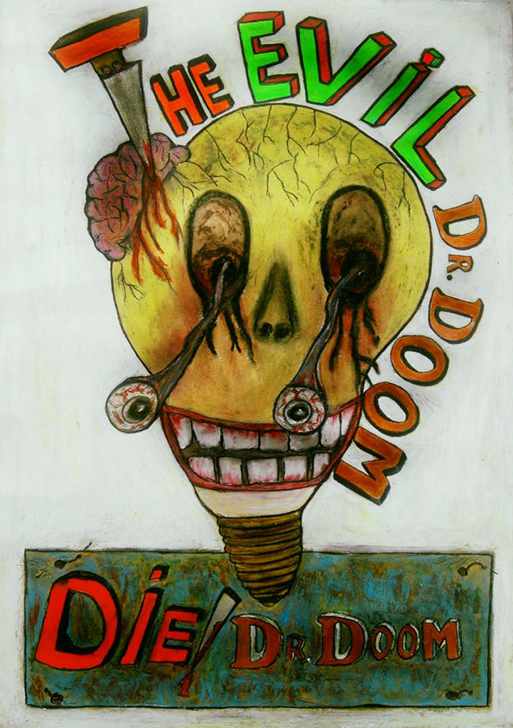 DIE! DR.DOOM mixed media on paper ballpoint, pencil,paint, fine liner,marker, oil pastel