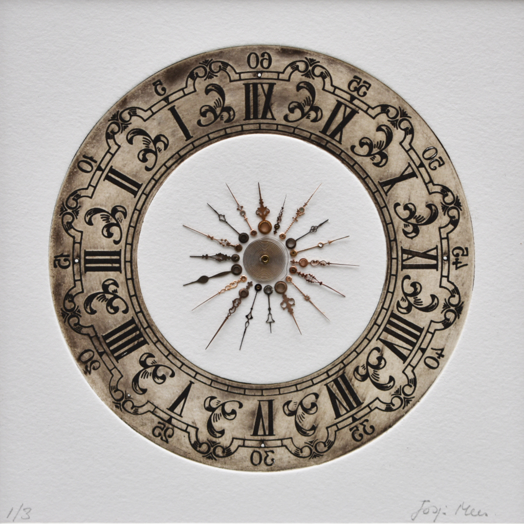 Afgedrukte wijzerplaat met in de kern horloge onderdelen uit horlogemakersatelier.