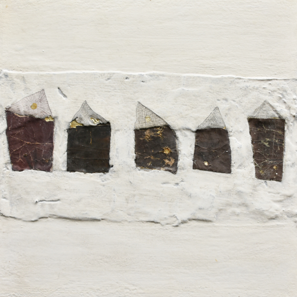 Gips, zand, restjes schuurpapier uit horlogemakersatelier, acryl, verguldsel. De huisjes geven "het leven" weer: aantasting maar ook schoonheid...