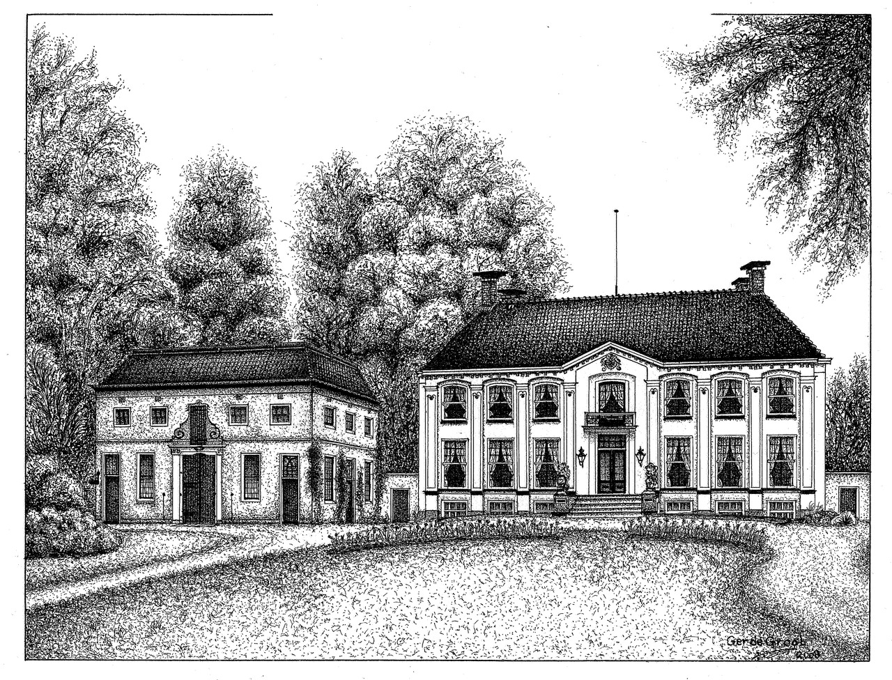 Ger de Groot, geboren 1941 in Hoorn, is autodidact. Hij maakt stippeltekeningen van monumenten in zijn geboorteplaats, van states in Friesland, van bijzondere panden in Brandenburg (Duitsland), maar ook van andere plekken in Europa die hij mooi vindt. hij werkt met zwarte inkt. Met een ragfijn pennetje zet hij de stippeltjes en streepjes inkt. Het resultaat is tekeningen van een verstilde sfeer.