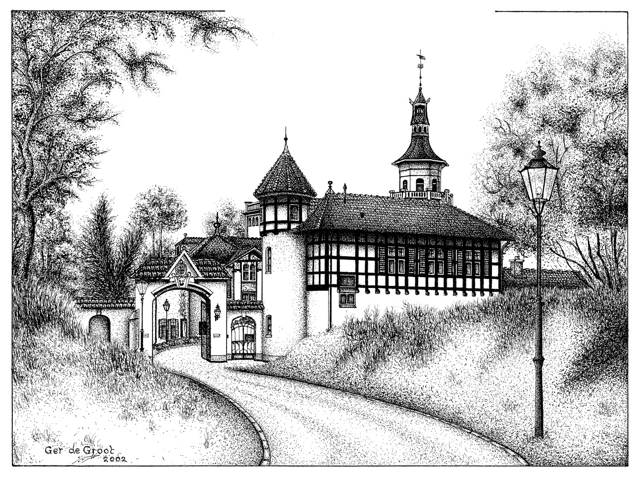 Ger de Groot, geboren 1941 in Hoorn, is autodidact. Hij maakt stippeltekeningen van monumenten in zijn geboorteplaats, van states in Friesland, van bijzondere panden in Brandenburg (Duitsland), maar ook van andere plekken in Europa die hij mooi vindt. hij werkt met zwarte inkt. Met een ragfijn pennetje zet hij de stippeltjes en streepjes inkt. Het resultaat is tekeningen van een verstilde sfeer.