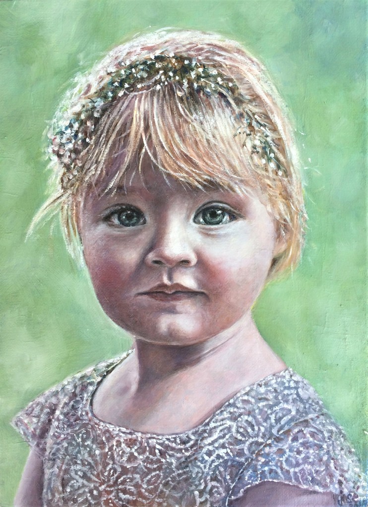 sprekend portret , bloemenkrans in het haar, kanten jurkje
