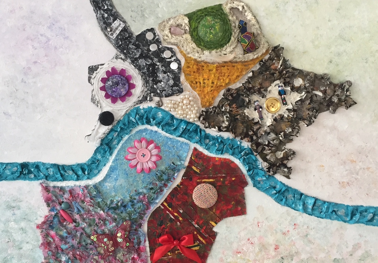 In opdracht. Team wil collega die met pensioen gaat een kunstwerk aanbieden. De teamleden hebben materiaal aangedragen. Daarmee is de plattegrond van Arnhem weergegeven.