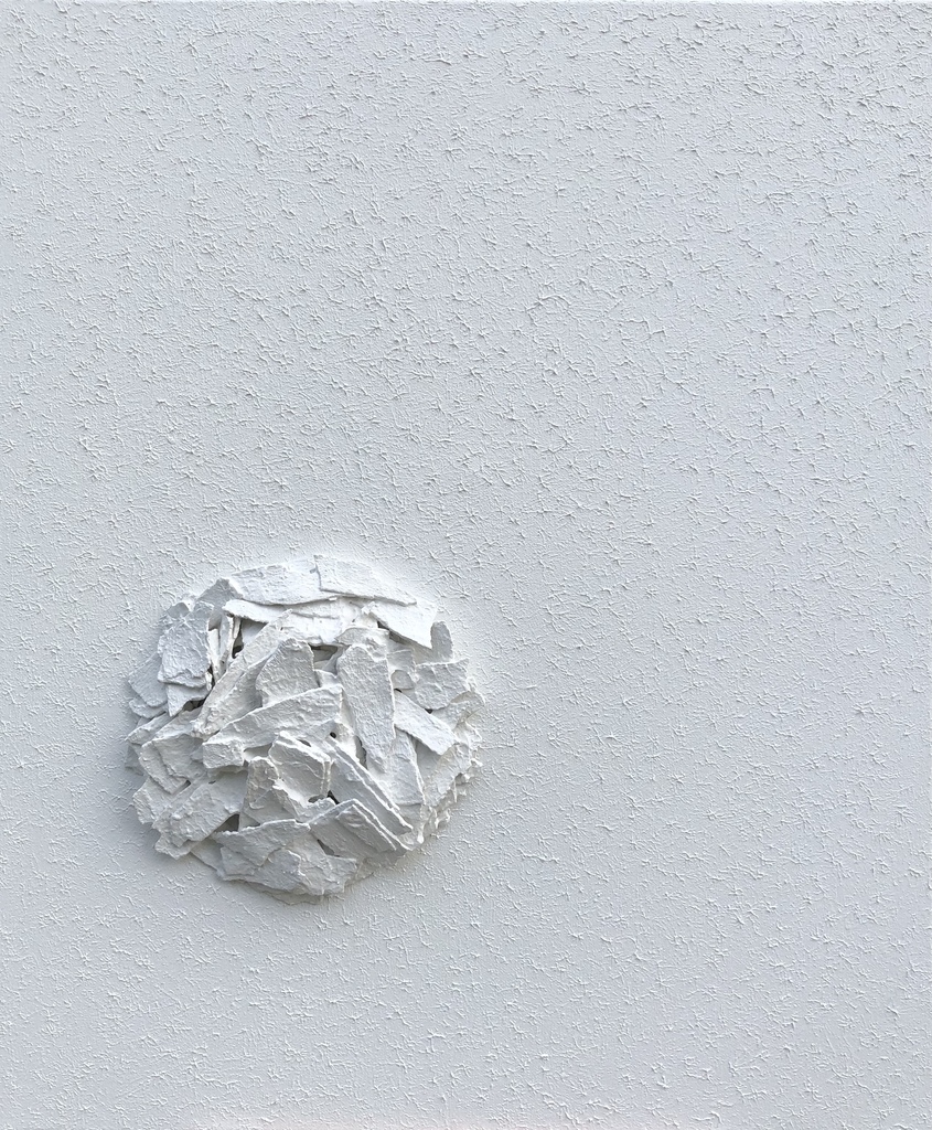 Boetseren met natuurlijk materiaal. Schors van de plataan in stukken gebroken en met acrylverf en sterke gel tot een cirkel geboetseerd. De structuur op het doek en op de schors is aangebracht met slijpsel van speksteen.
