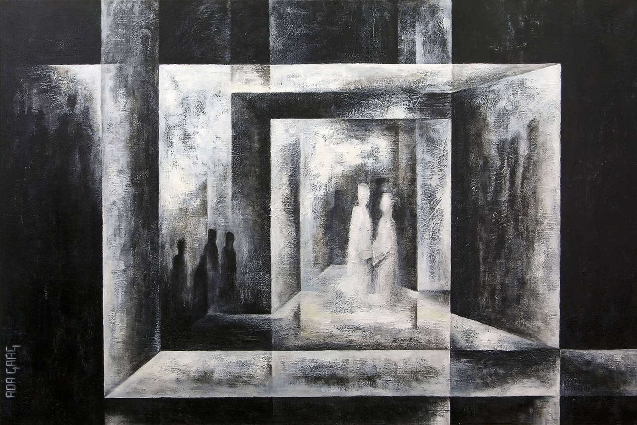 Abstract Mensen Gesprek Figuren Lijnenspel Zwartwit People Blackwhite Talking Emoties Poorten Acryl Levensweg
