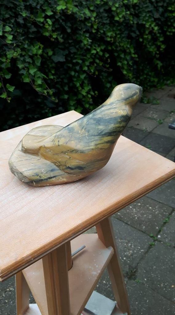 Geel met groen gemarmerd stylisch beeld van een vogel. Wat een grijzige steen was werd omgetoverd tot een geweldige intense kleur.