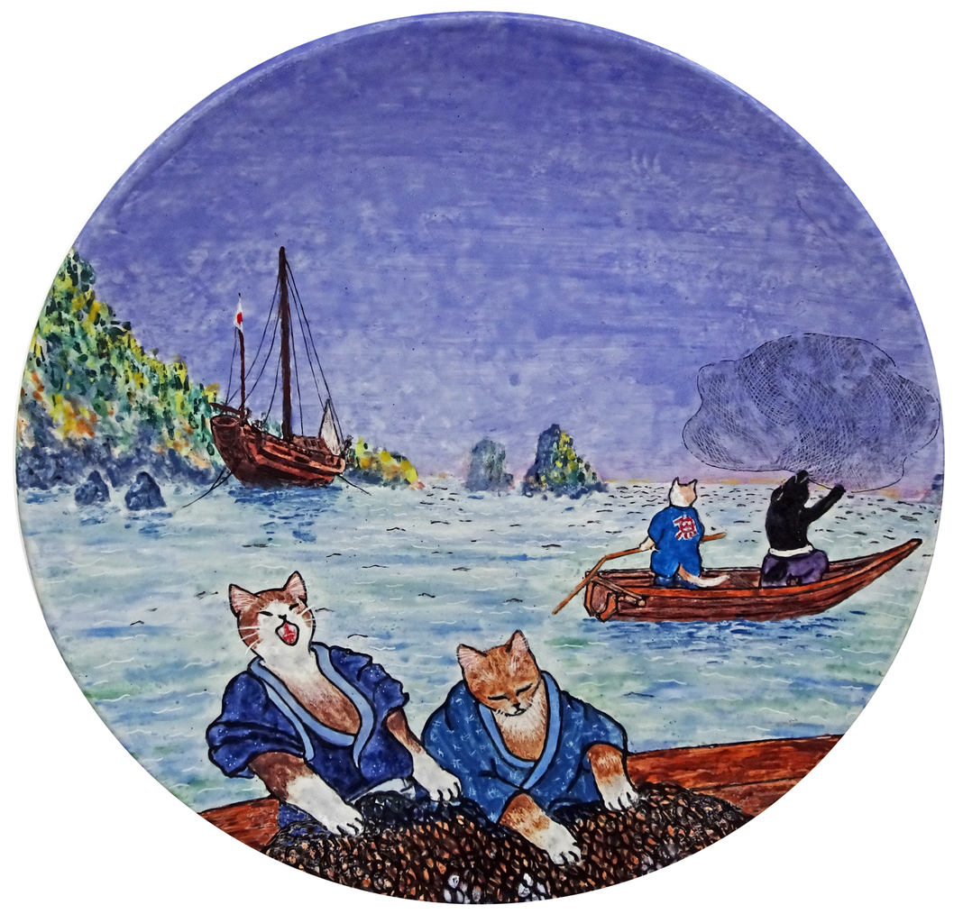 Landschap Zeegezicht Vissers Schepen Kat Keramiek Glazuur Japan Ceramics Cat Ship Fisherman Sea Landscape