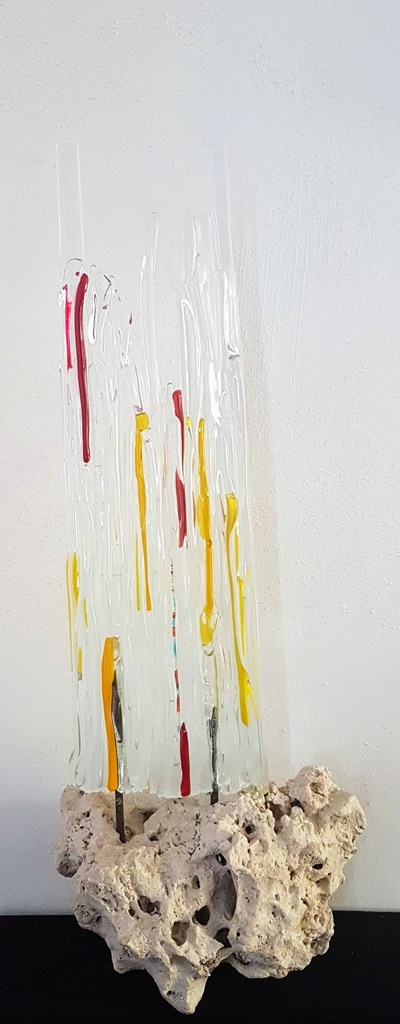 Gestapeld Spectrum glas. Helder met hier en daar een kleuraccent. Bevestigd op een brok natuursteen.
