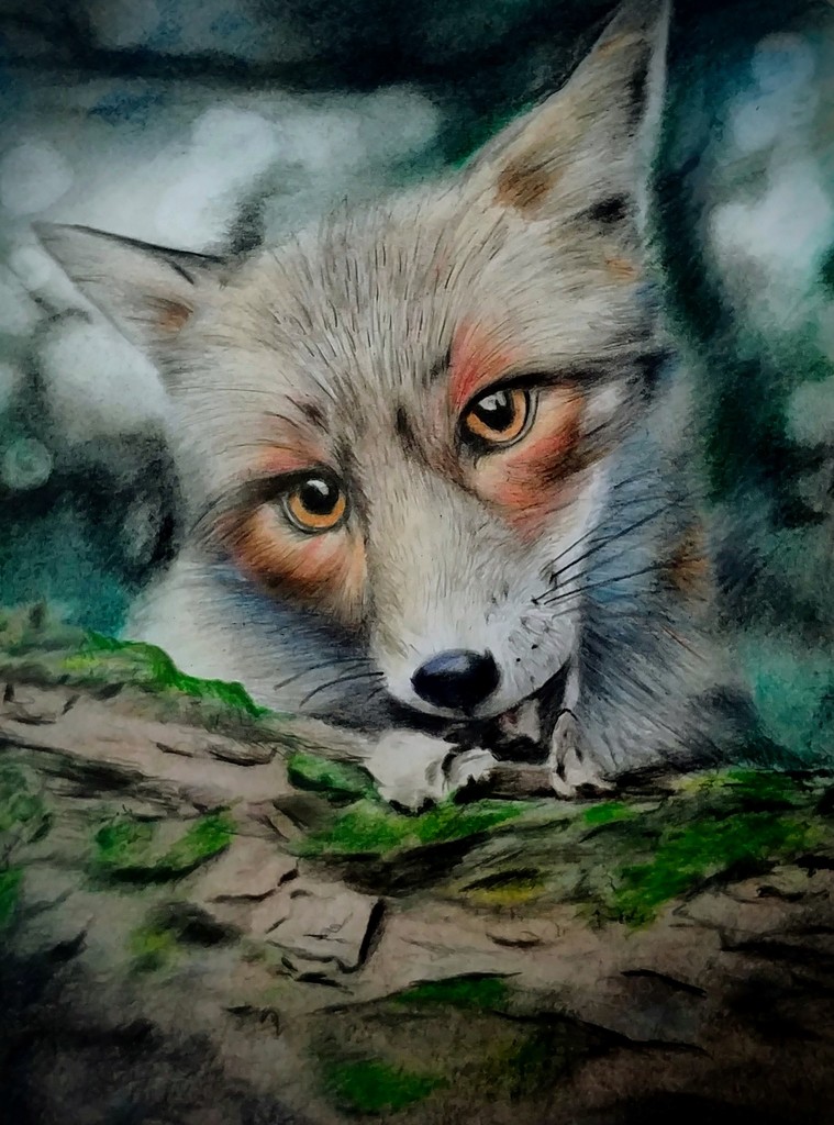 Kleurpotloodtekening van een vos
