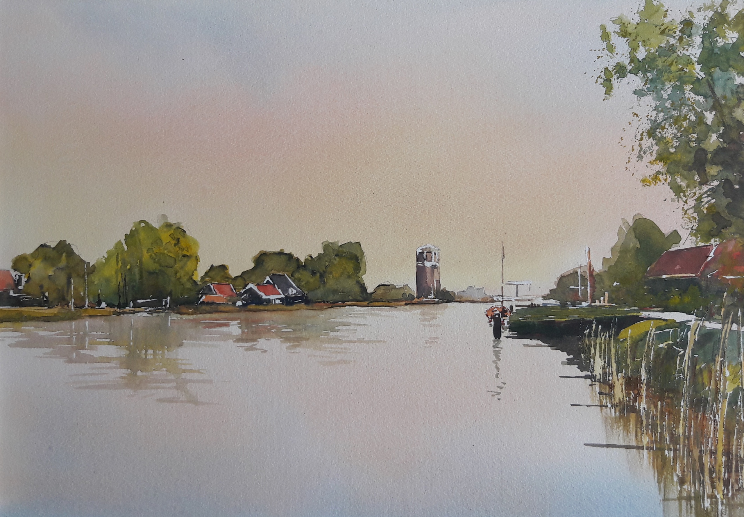 Over het water gezien bij Vrouwenverdriet: de Watertoren van Assendelft