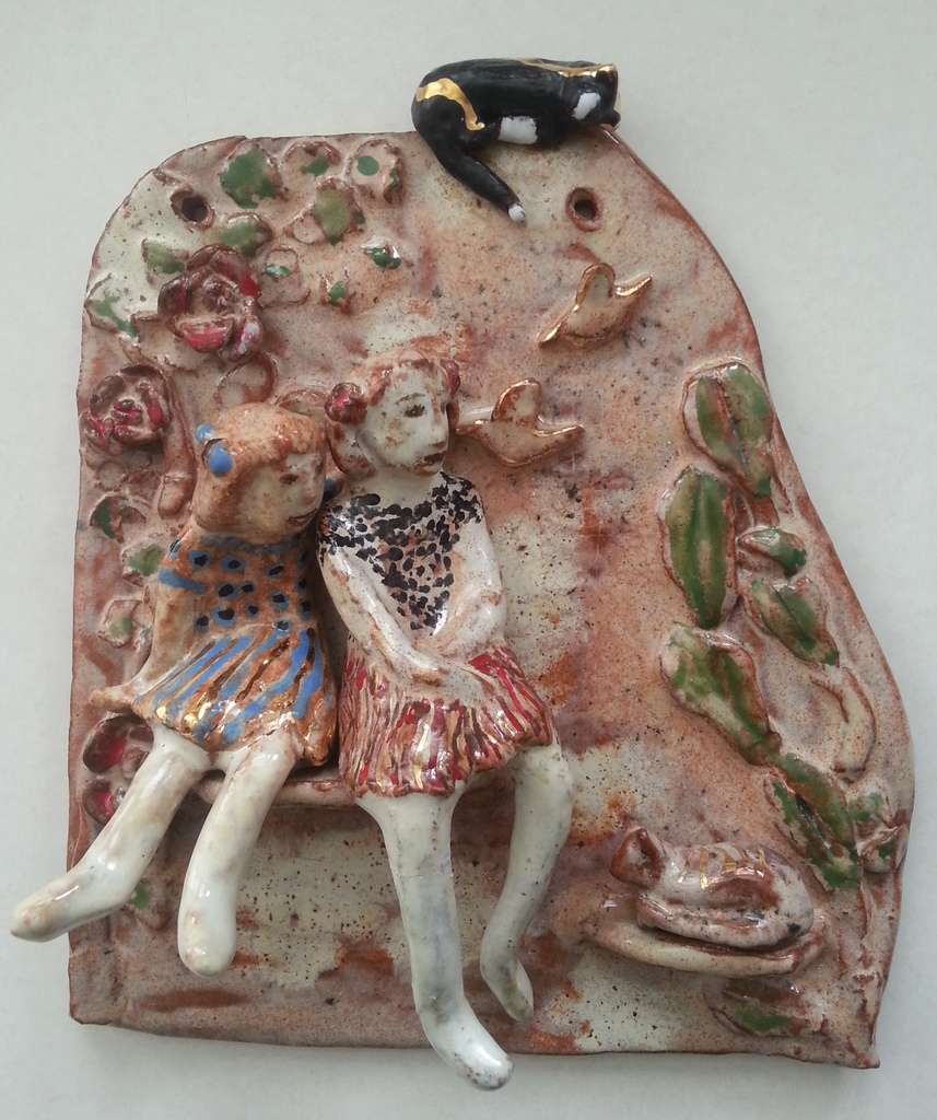 wandplaquette van hooggestookt aardewerk met Linne en Nika en hun twee poezen
