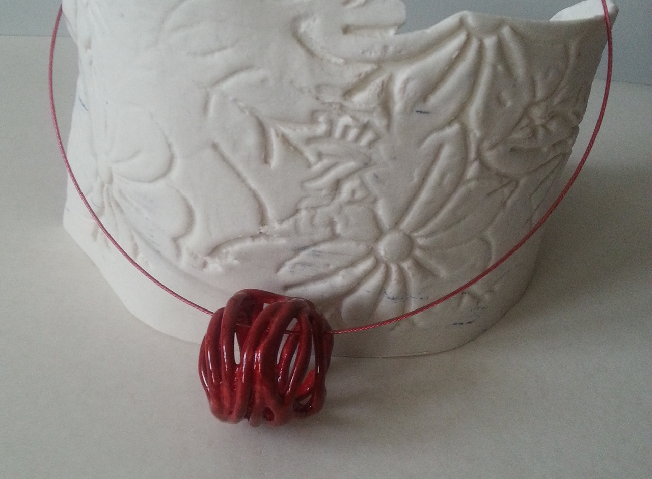 opengewerkte hanger van rood geglazuurd porselein aan rode spang