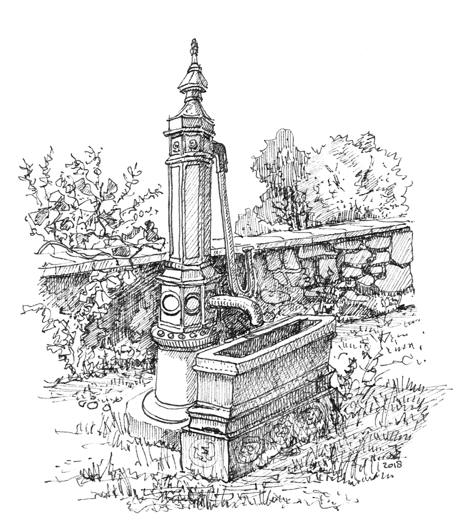Oud Waterpomp Pleintje Luzy Frankrijk Zwart Wit Pentekening Muur Begroeiing