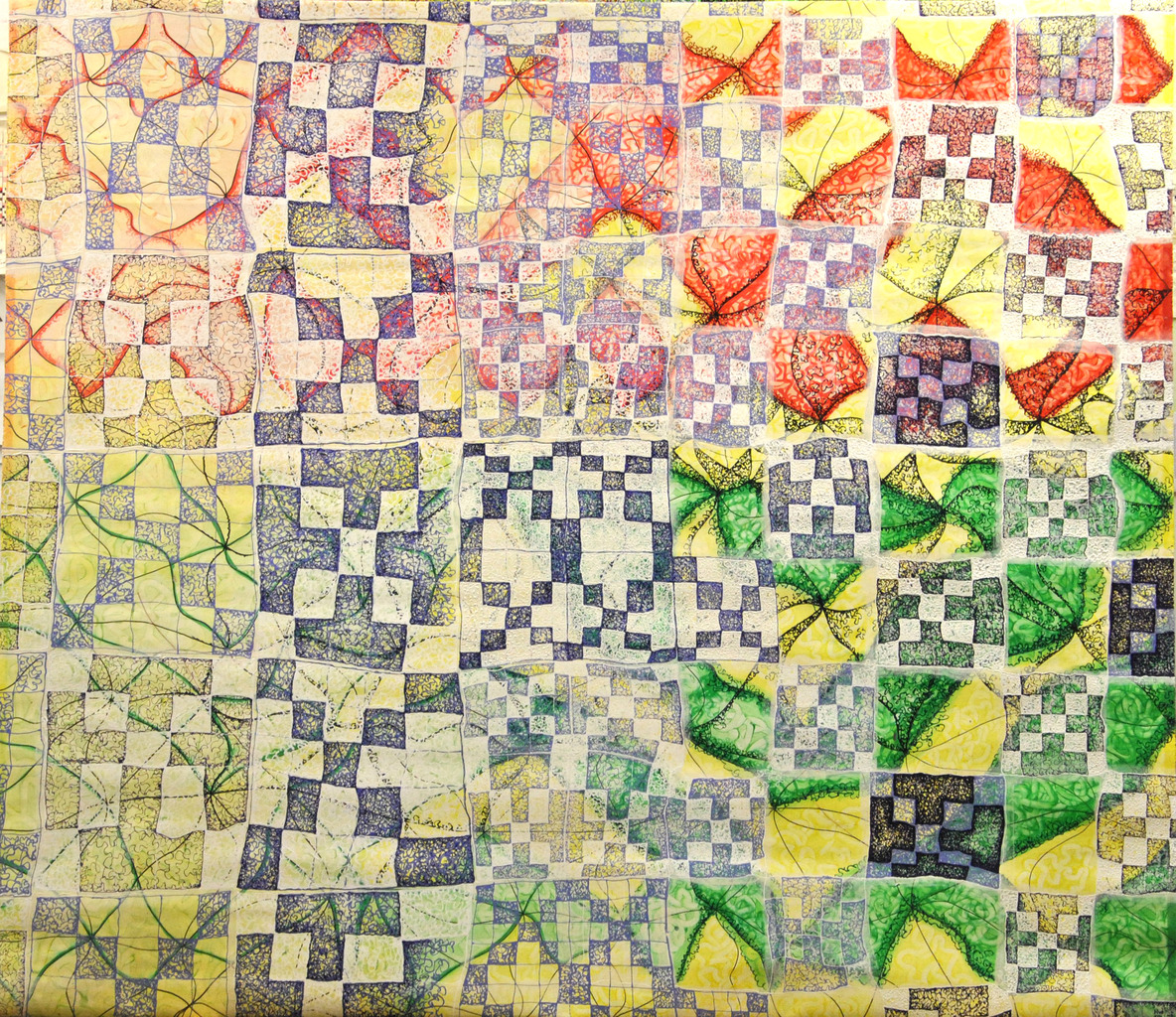 Thema: Chaos (Geometrische Chaos) Mijn kunst is beïnvloedt door de moderne wiskundige en wetenschappelijke benadering van het begrip complexe orde van de natuur. Met name heb ik me verdiept in de Chaos theorie en de fractal geometrie. Ik ben geen wiskundige, en ik gebruik geen wiskundige formules. De ideeën van de Chaos theorie en fractal geometrie leiden tot de ontwikkeling van de composities in mijn werk. Ik gebruik driehoeken,vierkanten en cirkels in mijn schilderijen, maar in mijn huidige serie, geoChao richt ik me alleen op de vierkanten en de verhoudingen tussen de vierkanten. Ik ontwikkel mijn composities door kleine vierkantjes op grote te zetten of grote op kleine te zetten. Het gaat om de onderlinge verhoudingen tussen de vierkanten. Ik laat de methode die ik kies de compositi