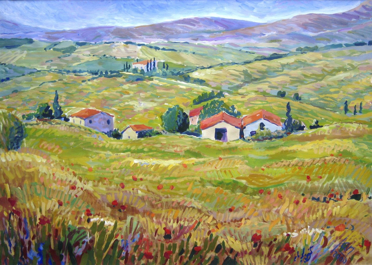 Heimwee naar Toscane: geen vakantiefoto maar een ansichtkaart is het uitgangspunt van dit schilderij.
