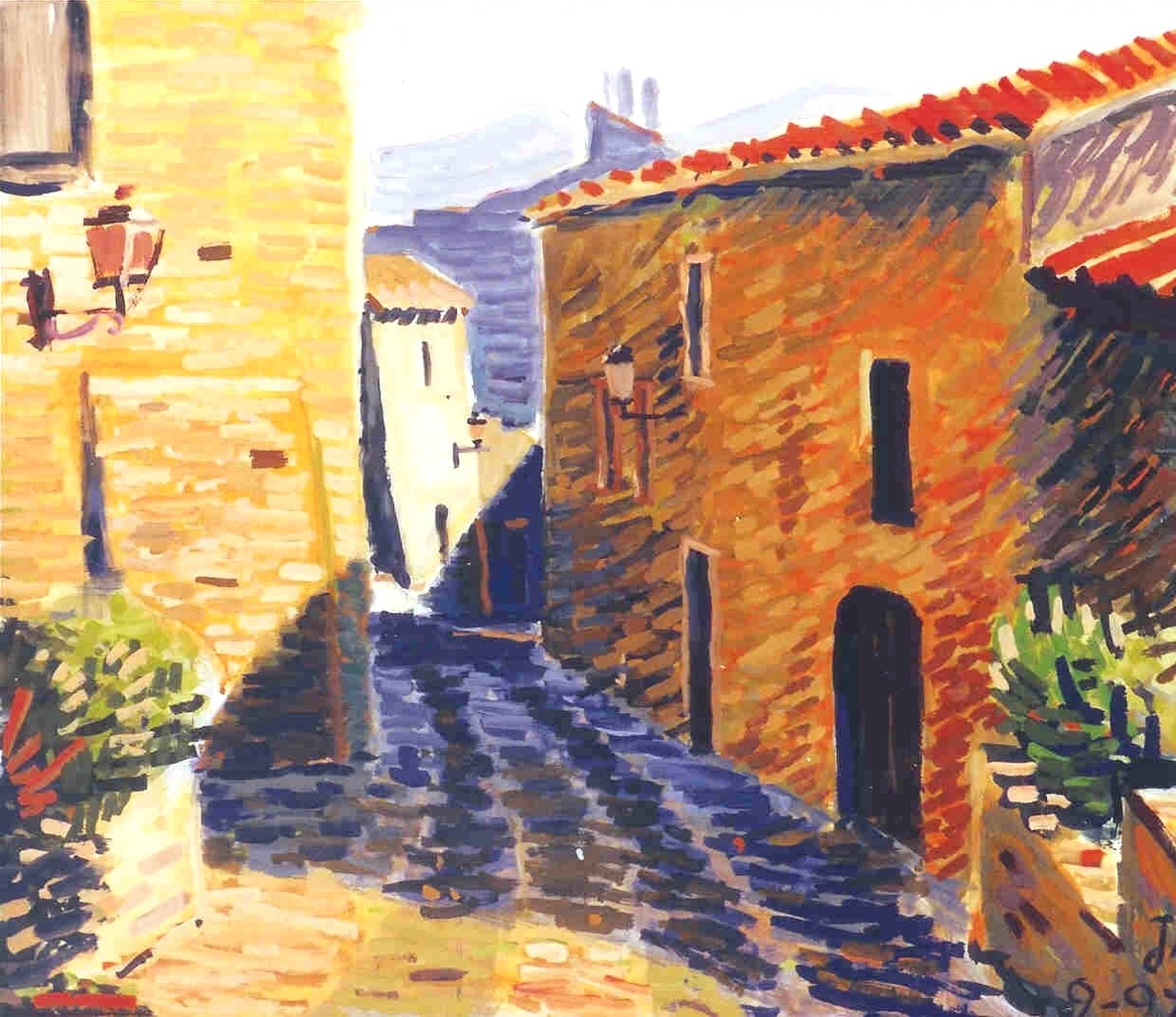Een vakantie aan de Costa Brava bracht ons -mijn zoon Hans en mij- naar Tossa de Mar. Aan de hand van een schets en een foto ontstond thuis dit werk.