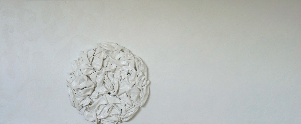 Boetseren met textiel en verf. Op de achtergrond diverse lagen acrylverf met dunne textieldelen. Op de voorgrond geboetseerd met textiel, acrylverf, heavygel en behangerslijm, hoogglansvernis.