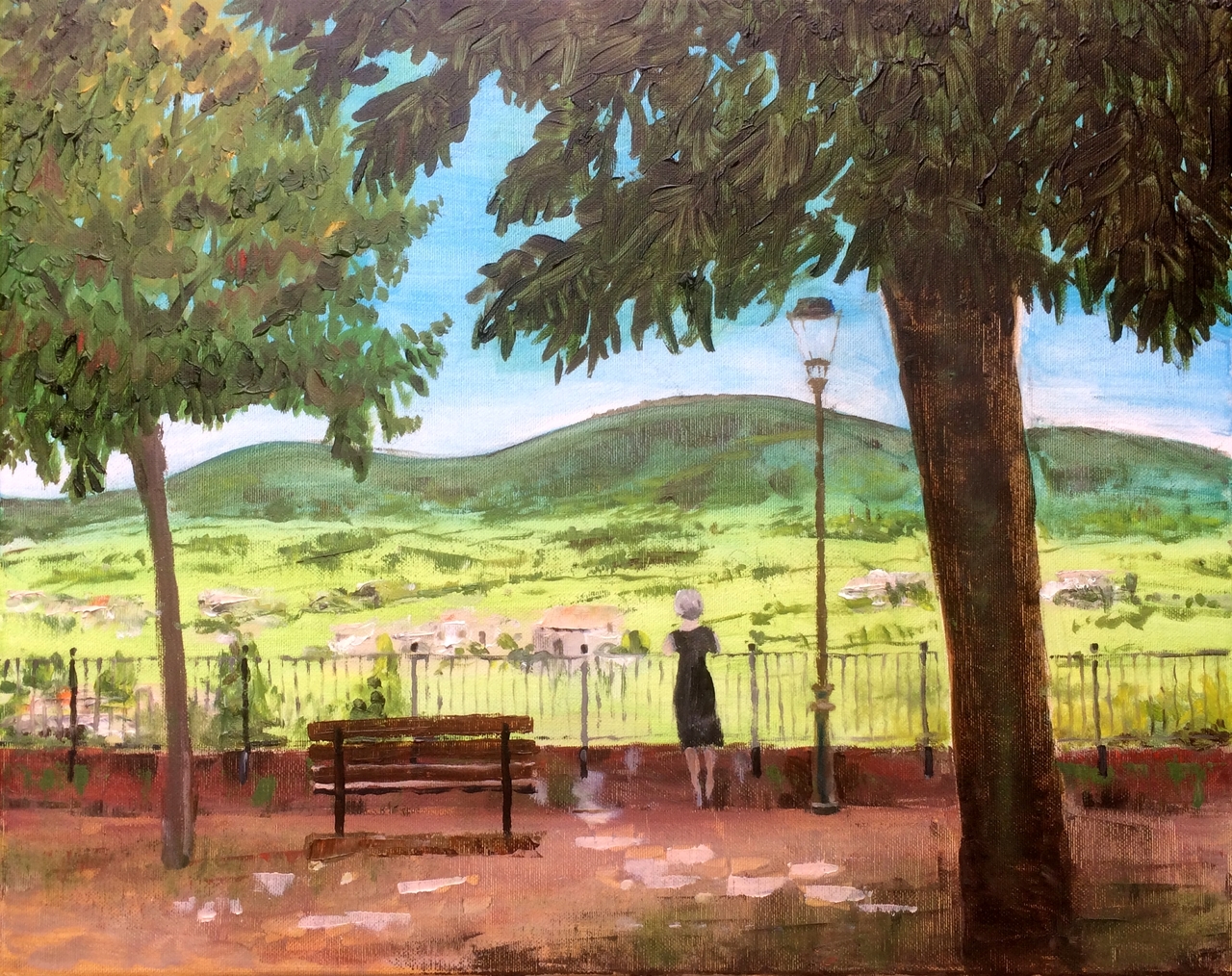 Geschilderd naar een foto van onze vakantie in de Ardèche. Vanaf het terras naast de Saint-Sarurnin kijkt Corry uit over de velden.