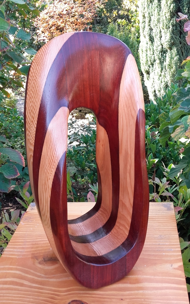 De Mobiüs Combi is gemaakt van Padoek en Oregon Pine allemaal delen van 55x5x5 gezaagd daarna verlijmd - uitgehakt - gerapst - geschuurd