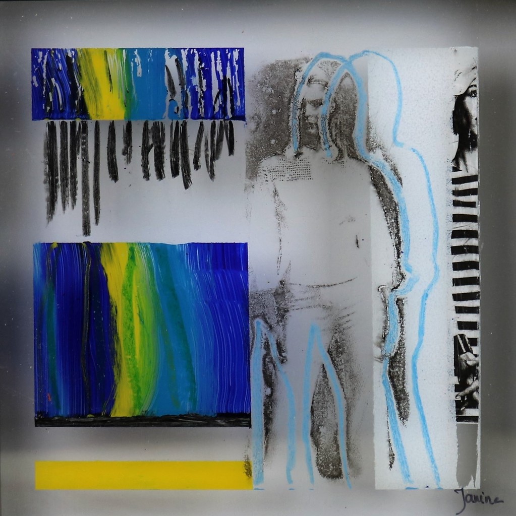 gemengde druk-technieken op plexiglas transparant, ingelijst in een lijst zodat de achtergrond 3 cm naar achteren valt, waardoor door lichtval de schaduwwerking meedoet in het werk.