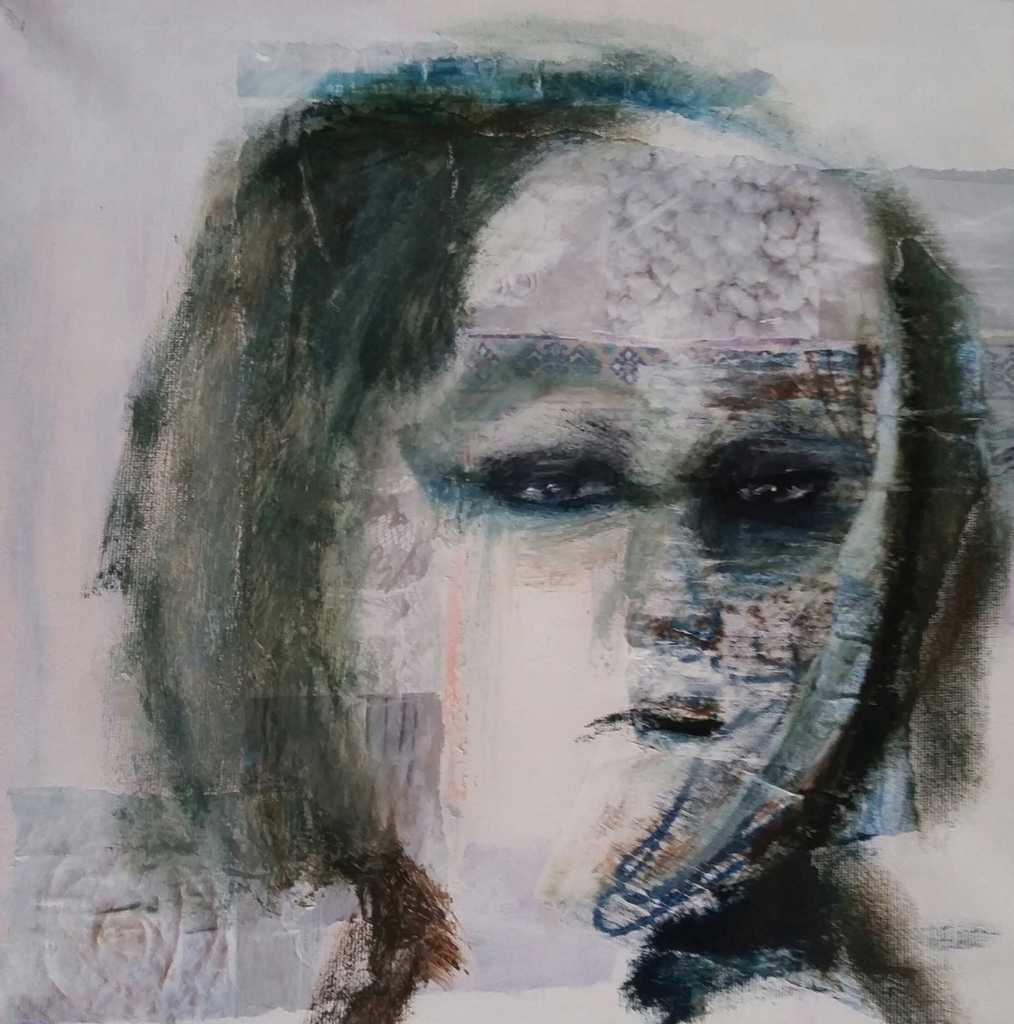 Door een combinatie van tekeningen van mezelf en stukjes tijdschrift en hierover een portret te schilderen, is een boeiend beeld ontstaan vol emotie.