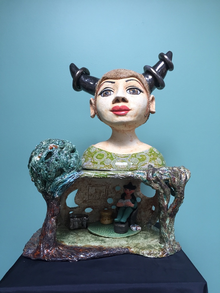 Cecile maakt keramische beelden, potten, dozen en tegels en geluksvisjes. Koppen met hoofdtooi of badmuts. Sprookjesachtig en kleurrijk geglazuurd. Cecile ter Borgh is lid van de SKNH en heeft werk in stock bij Galerie Stam in Amsterdam.