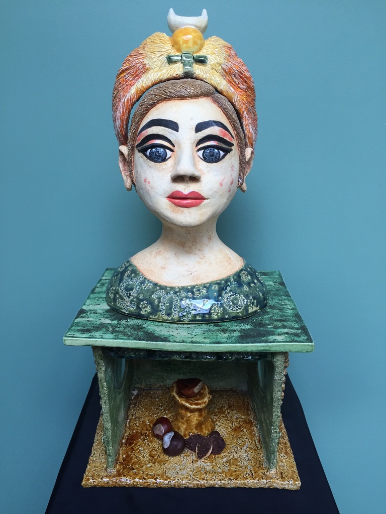 Cecile maakt keramische beelden, potten, dozen en tegels en geluksvisjes. Koppen met hoofdtooi of badmuts. Sprookjesachtig en kleurrijk geglazuurd. Cecile ter Borgh is lid van de SKNH en heeft werk in stock bij Galerie Stam in Amsterdam.
