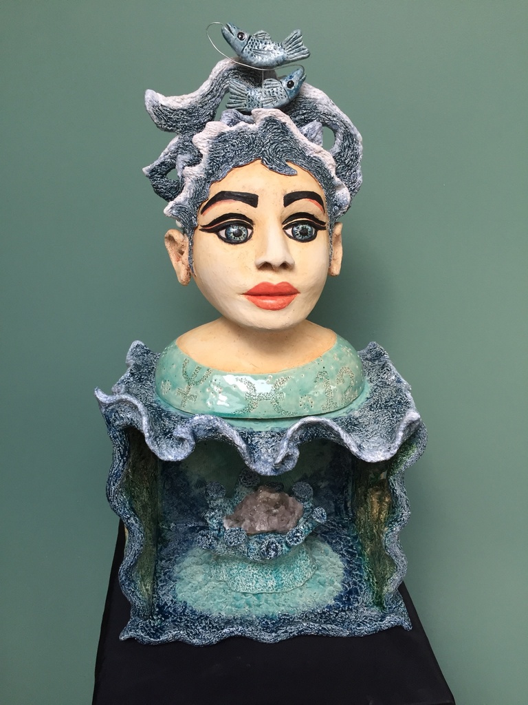 Cecile maakt keramische beelden, potten, dozen en tegels en geluksvisjes. Koppen met hoofdtooi of badmuts. Sprookjesachtig en kleurrijk geglazuurd. Cecile ter Borgh is lid van de SKNH en heeft werk in stock bij Galerie Stam in Amsterdam.