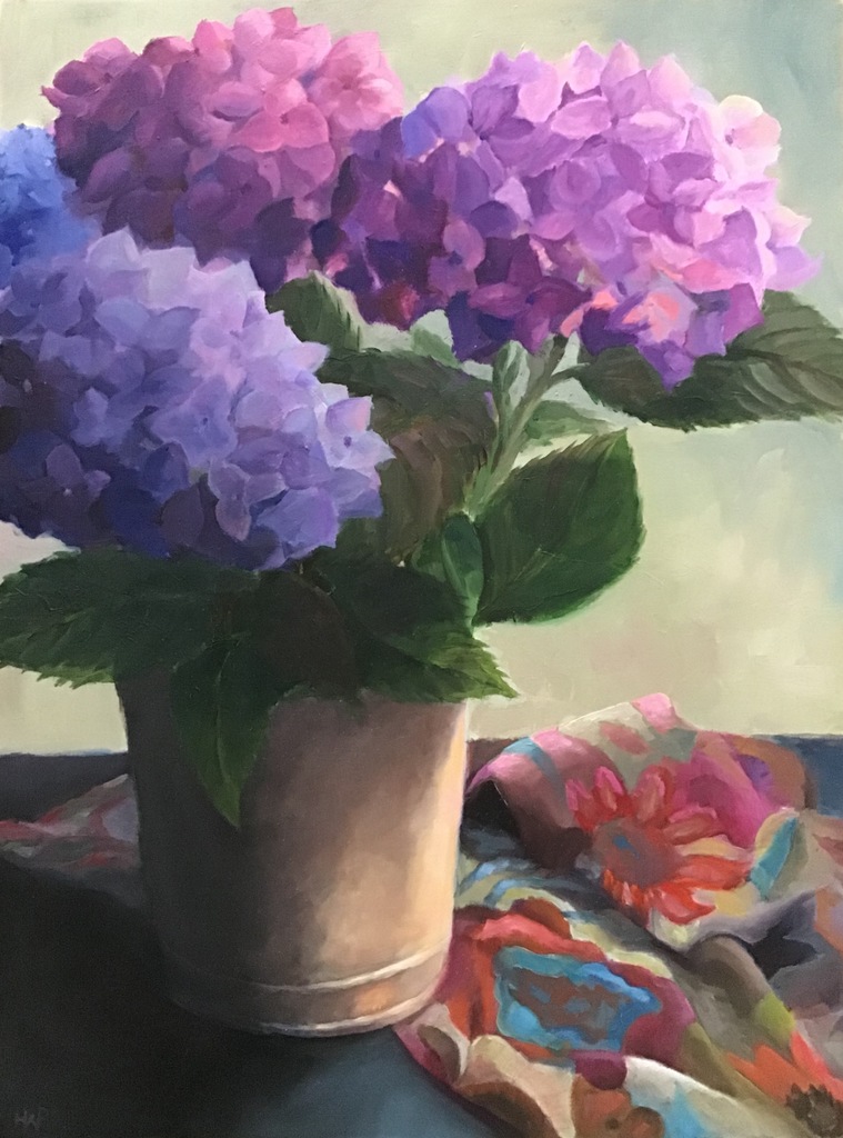Hortensia Rose Paars Groen Kleed Bloemen Figuratief Olieverf Kleurrijk Bloemig Licht Donker Warm Koud