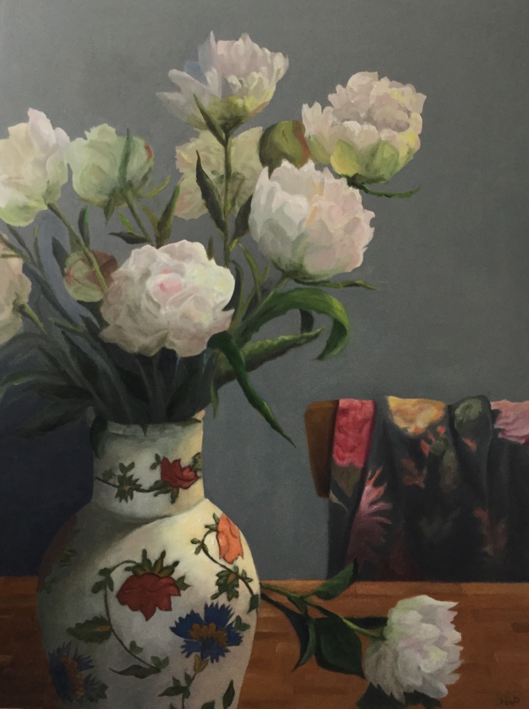 Wit Figuratief Blauw Groen Licht Stoel Rozen Kleurrijk Realistisch Olieverf Paneel Donker Koud Tafel Kleed Warm Boeket Fris Pioenrozen Rosé Bloemig