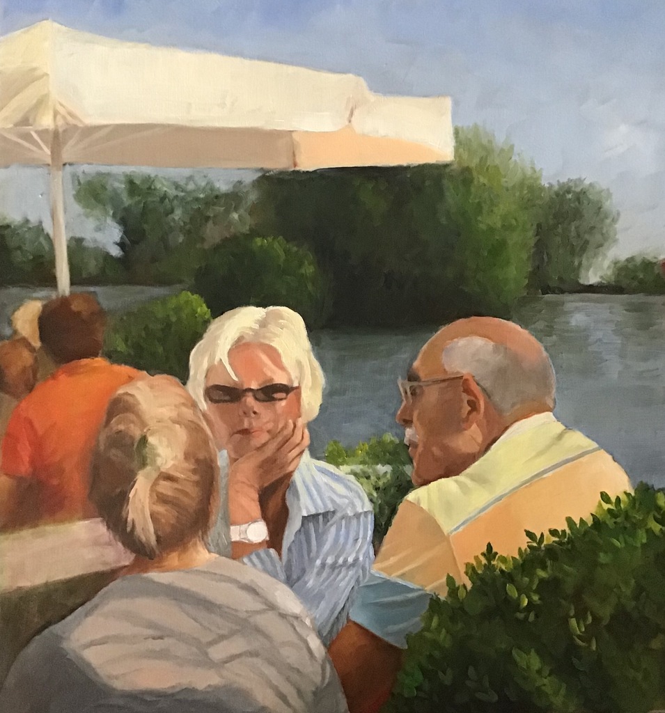 Figuren Terras Zon Man Vrouw Natuur Water Meer Vrolijk Kleurrijk Lichtval Licht Donker Blauw Groen Oranje Grijs Wit Figuratief Realistisch