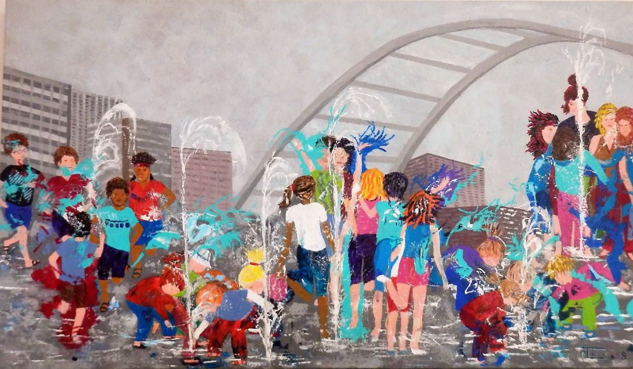 Een spetterend tafereel met kinderen en jeugd op een plein met fonteinen