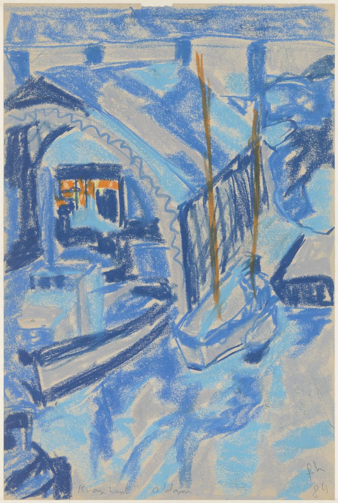 Kromhout-werf in blauw krijt, vanuit buurmans raam getekend aan de Oosterburgergracht, Amsterdam. c. 45 x 60 cm; op papier geschonken aan het Amsterdams Archief, de Beeldbank