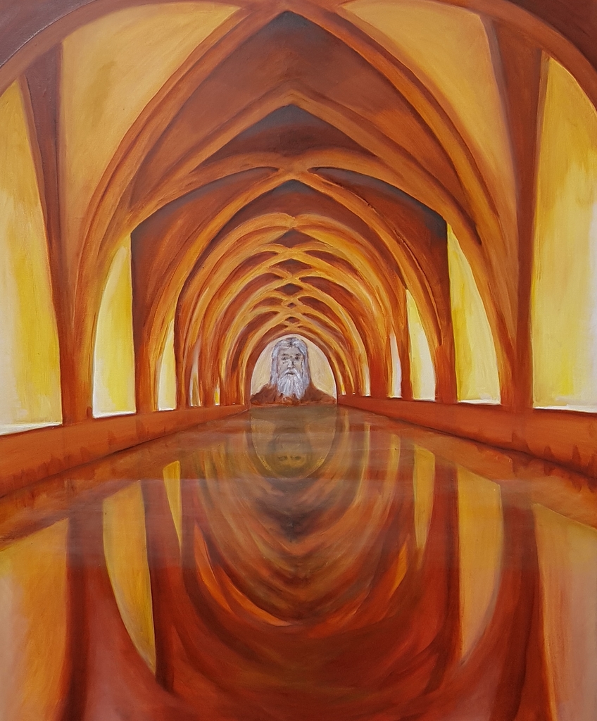 Een gebouw, van oorsprong religieus, een man, zoals men zich (een) god wel voorstelt, weerspiegeld in het water. Maar die spiegeling is niet de godsfiguur, maar degene die naar het schilderij kijkt... 120x90cm.