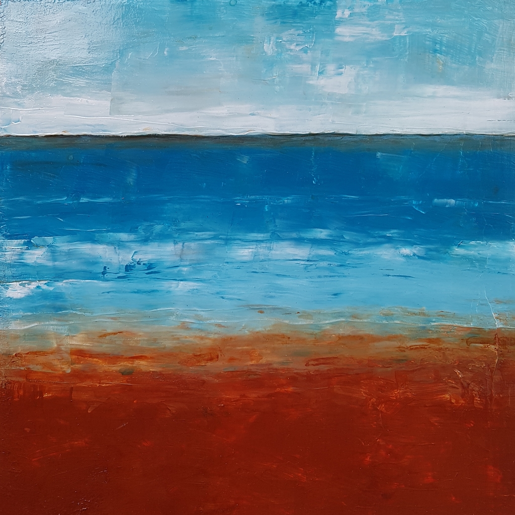 De zee als kraamkamer van het leven op aarde. Een abstraherend en expressief zeegezicht. 40x40cm