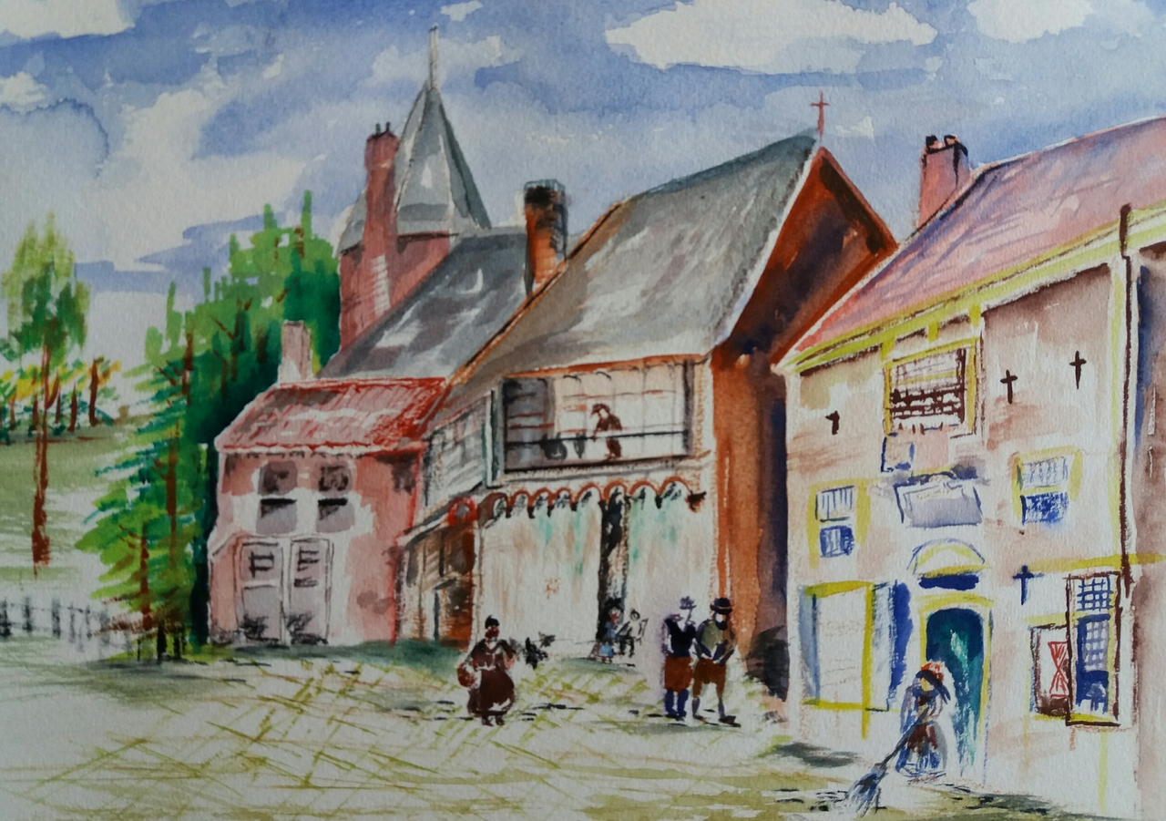 Straatje geinspireerd naar oude schildering, Aquarel op papier