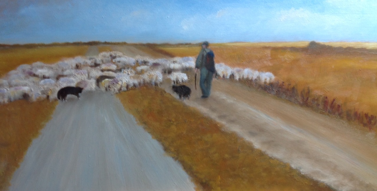 Blauw Oker Olieverf Natuur Schapen Herder