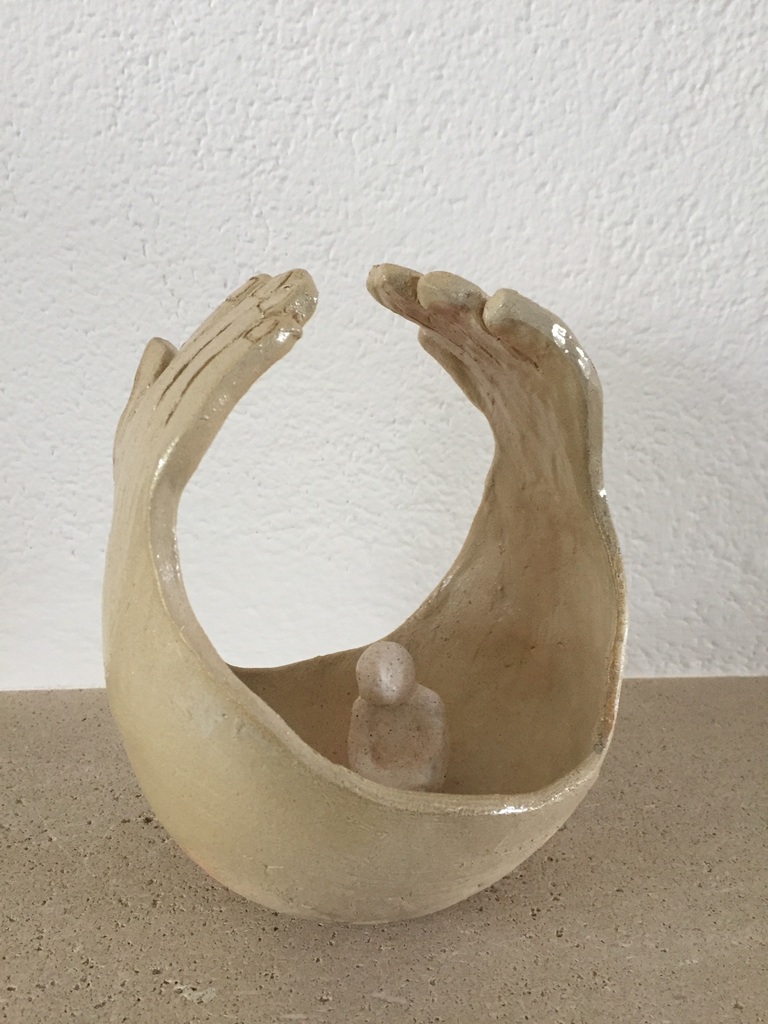 twee beschermende handen met een zittend figuur erin
