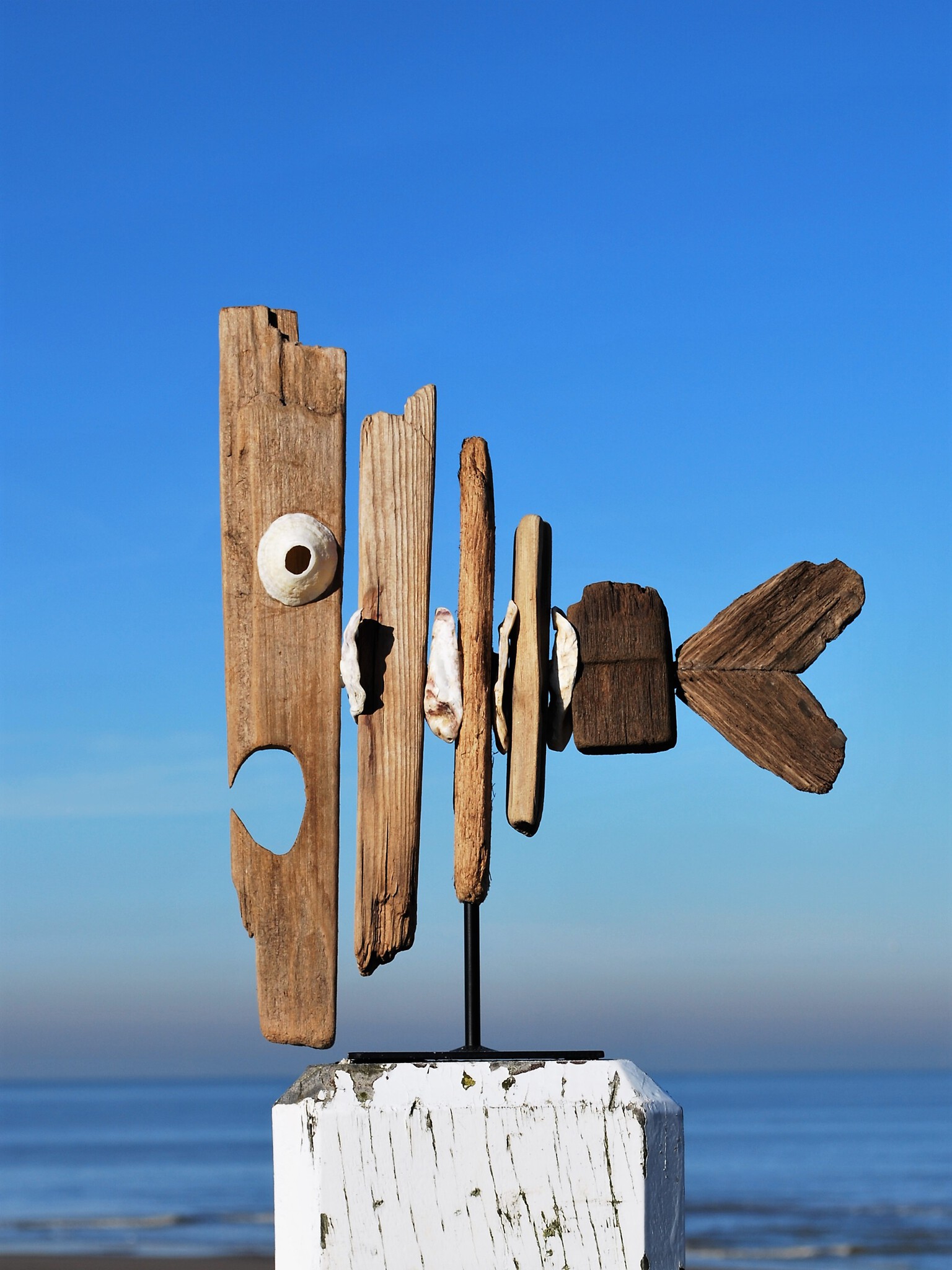 maakt al jaren houten beelden door natuurlijke objecten uit zee te koppelen. De beelden zijn ruw en puur.