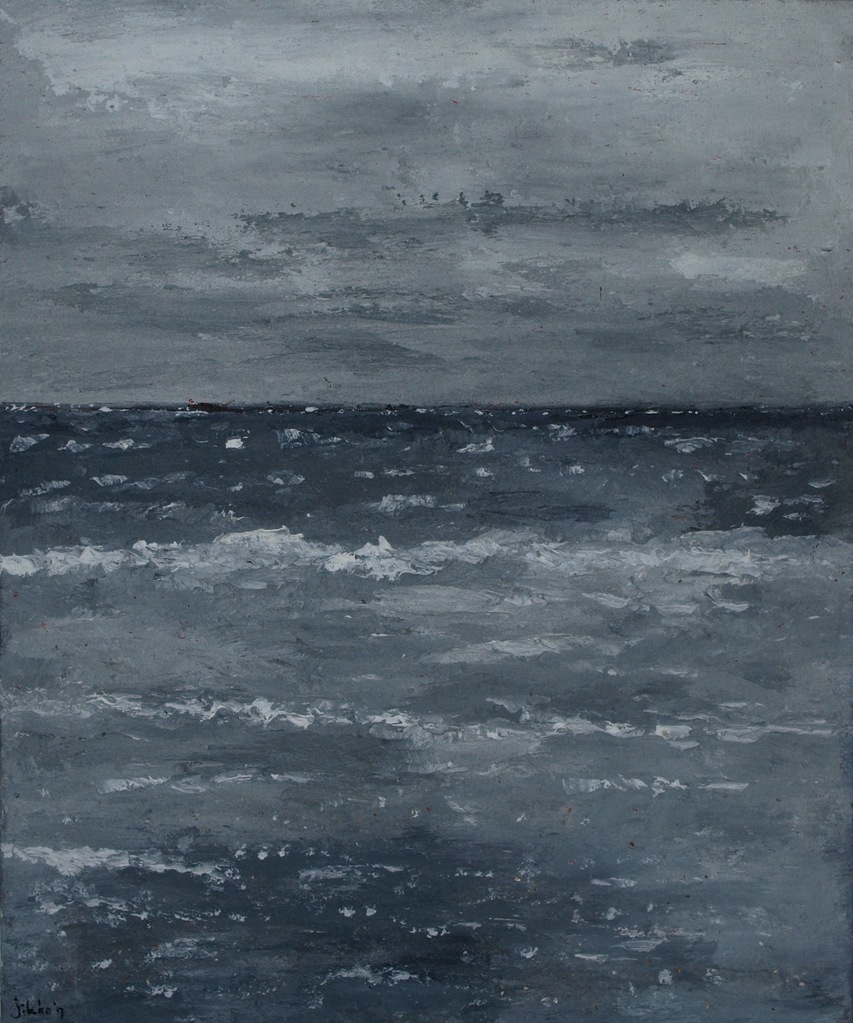 Zeegezicht in zwarte, witte en grijze tinten.