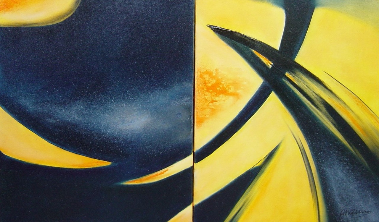Tweeluik in zwarte baklijst abstracte beweging in de ruimte in olieverf op doek.