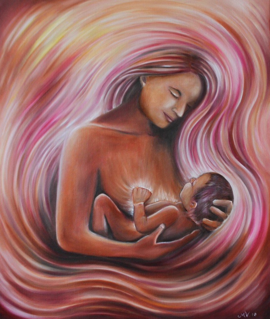Een schilderij van een moeder met pasgeboren baby, geschilderd vanuit mijn gevoel. Het gaat over de geboorte van een kind, maar ook de geboorte van de moeder, van moedershap of ouderschap. Ook verkrijgbaar als kaart.