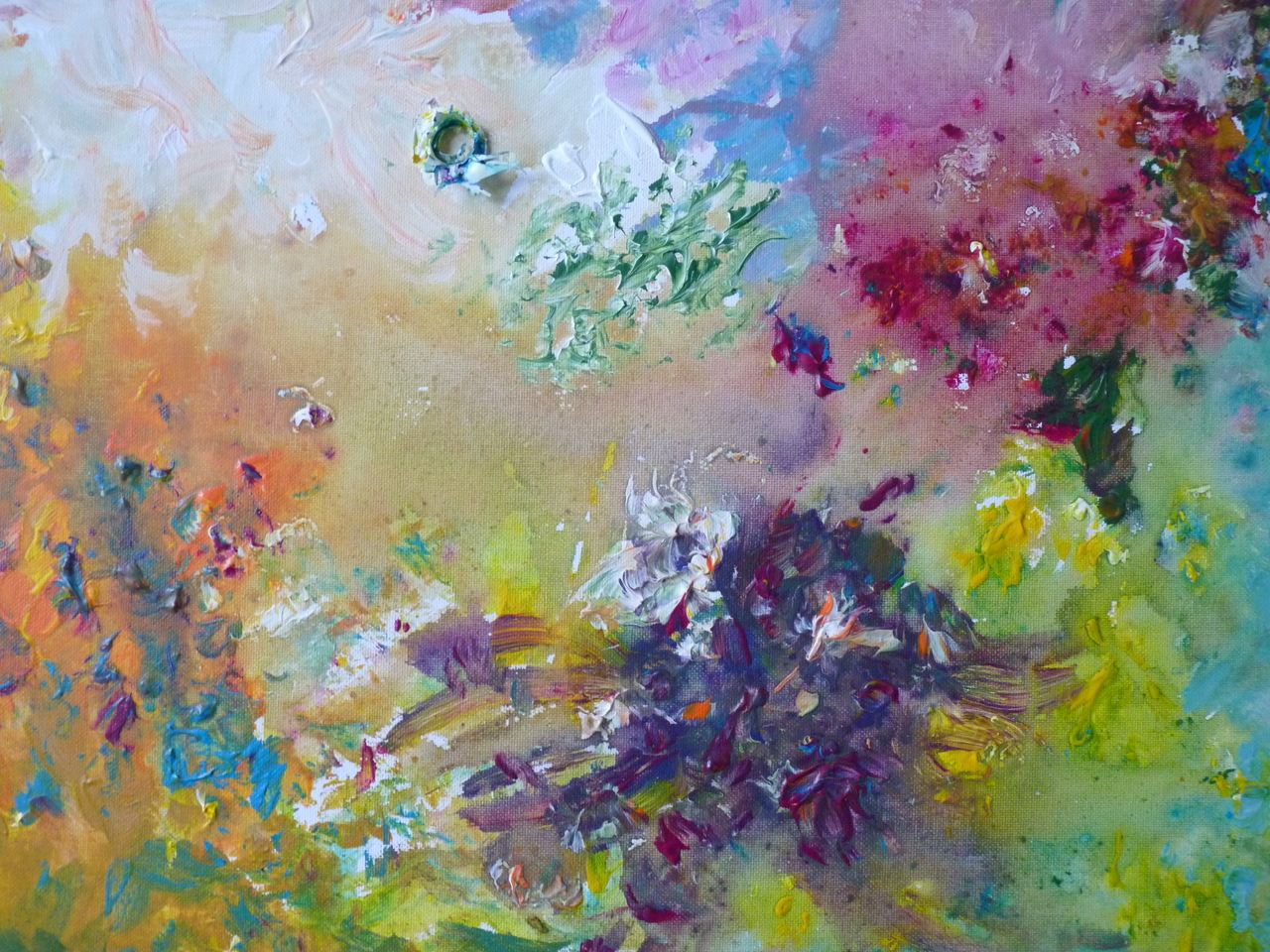 Met behulp van wat er zoal op tafel ligt (theezakje, mandarijnschil,tissue, verfrest uit de verfbus) is de verf bewerkt.