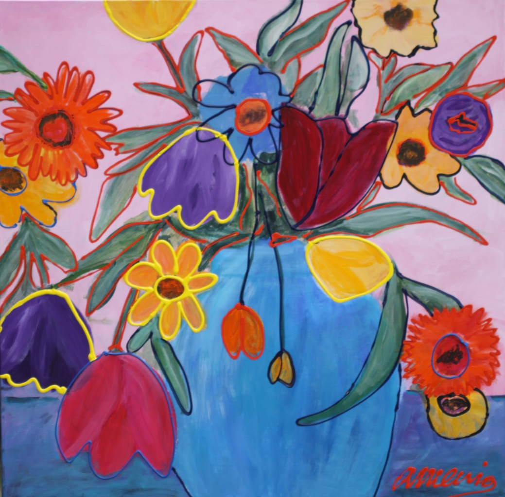 Bloemen in blauwe vaas kleurrijk met spuitwerk.