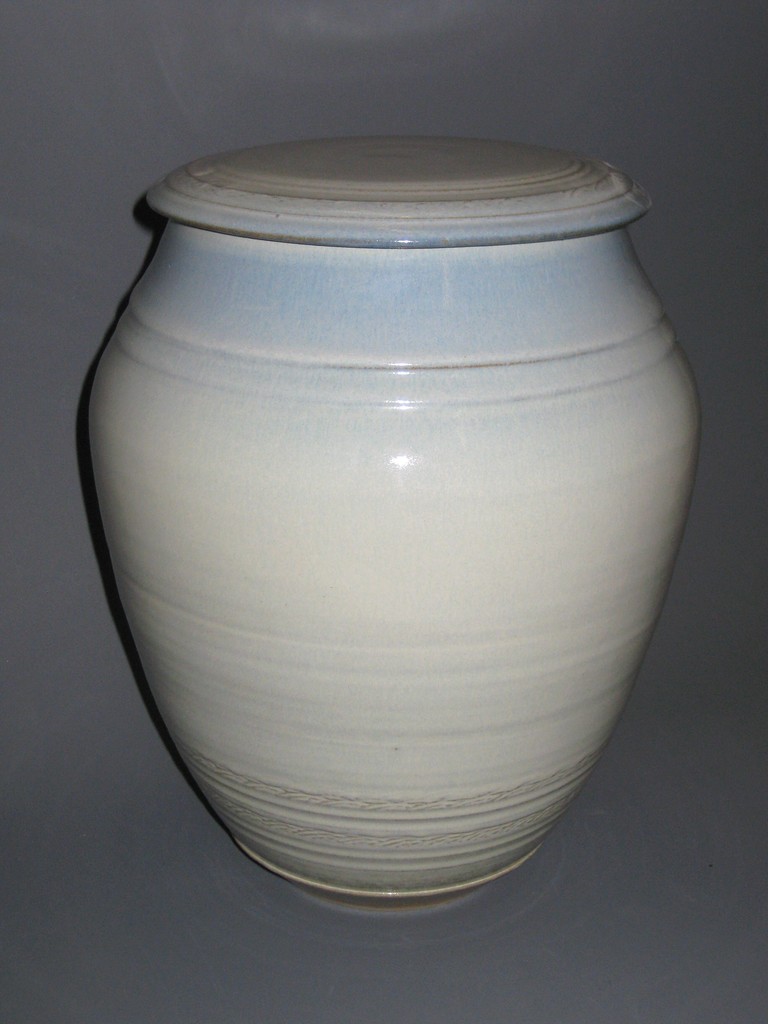 Mooie gebroken-witte urn met aan de bovenkant wat blauw/grijs. Ambachtelijk op de schijf gedraaid en voorzien van eigen glazuur. Op 1250 graden gebakken dus ook geschikt om buiten te zetten. De inhoud is 5 liter.
