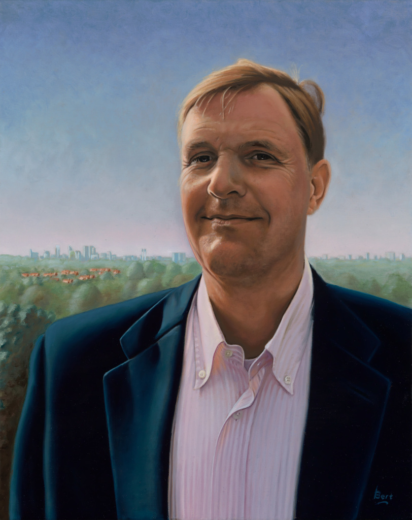 Portret van Erwin Wiersum, vader van Nour, Zizou en Laurine en echtgenoot van Amira Abou Zeid (zie andere portretten). In opdracht. Op de achtergrond de huizen van de wijk waar hij woont en de skyline van Den Haag.