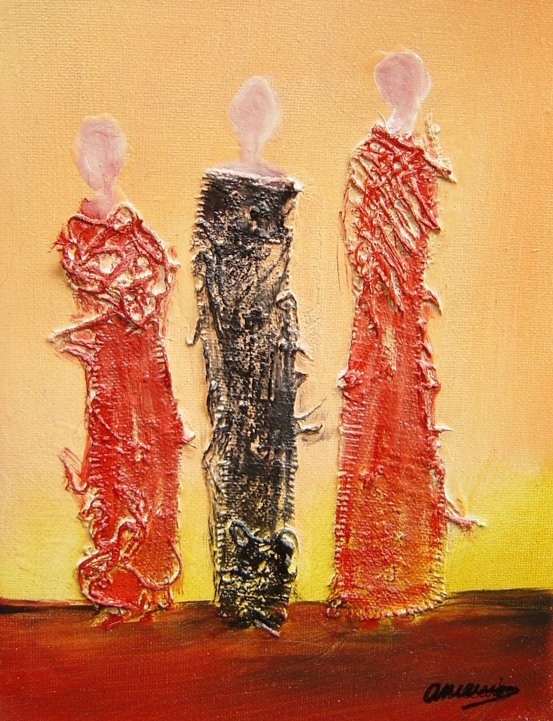 Deze modeshow toont de laatste creaties van een franse couturier. Geschilderd op doek met collage van stof en acryl. Eén doekje van een drieluik in zwarte baklijst.
