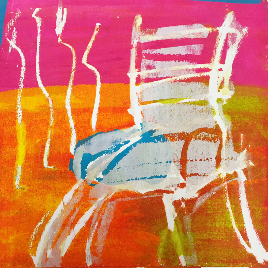 Nummer 1 in de serie Stoelen. Fabrique Unique, want uniek werk en dus een monoprint. Schilderen op een zeefdrukzeef, dus alle zeefdrukken zijn uniek, en met een culinaire twist. 19 x 19 cm en ingelijst in lijst van blank hout met museumglas, deze is 40 x 40 cm. VERKOCHT