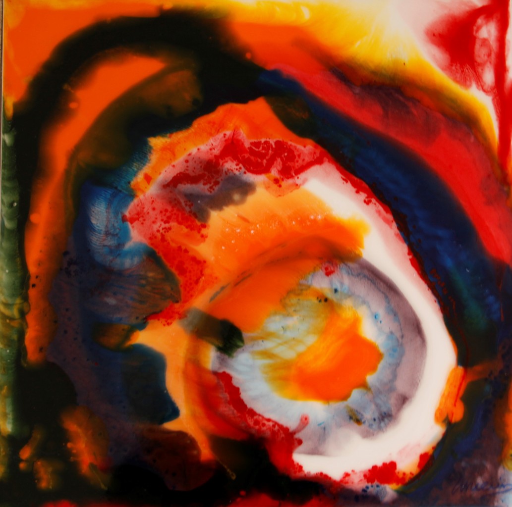 Diepzinnige vormen van kleuren op een 3d paneel gegoten epoxy met inkt.