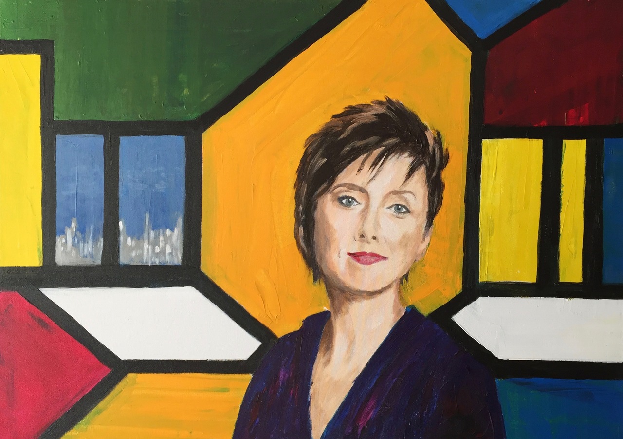 Portret van Annelies Beck, politiek interviewer van het programma Terzake op Canvas. Op de achtergrond een evocatie van de partijkleuren en het decor van het programma (2018)